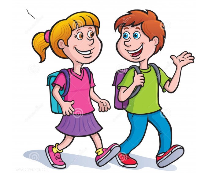 דָּנִיאֵל ואִילָנִית הוֹלְכִים בְּיַחַד לְבֵית הַסֵּפֶר.