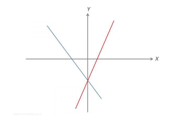 אם משוואת הישר הכחול היא: \[\begin{aligned} y=-4x-9 \end{aligned}\] מה עשויה להיות משוואת הישר האדום?